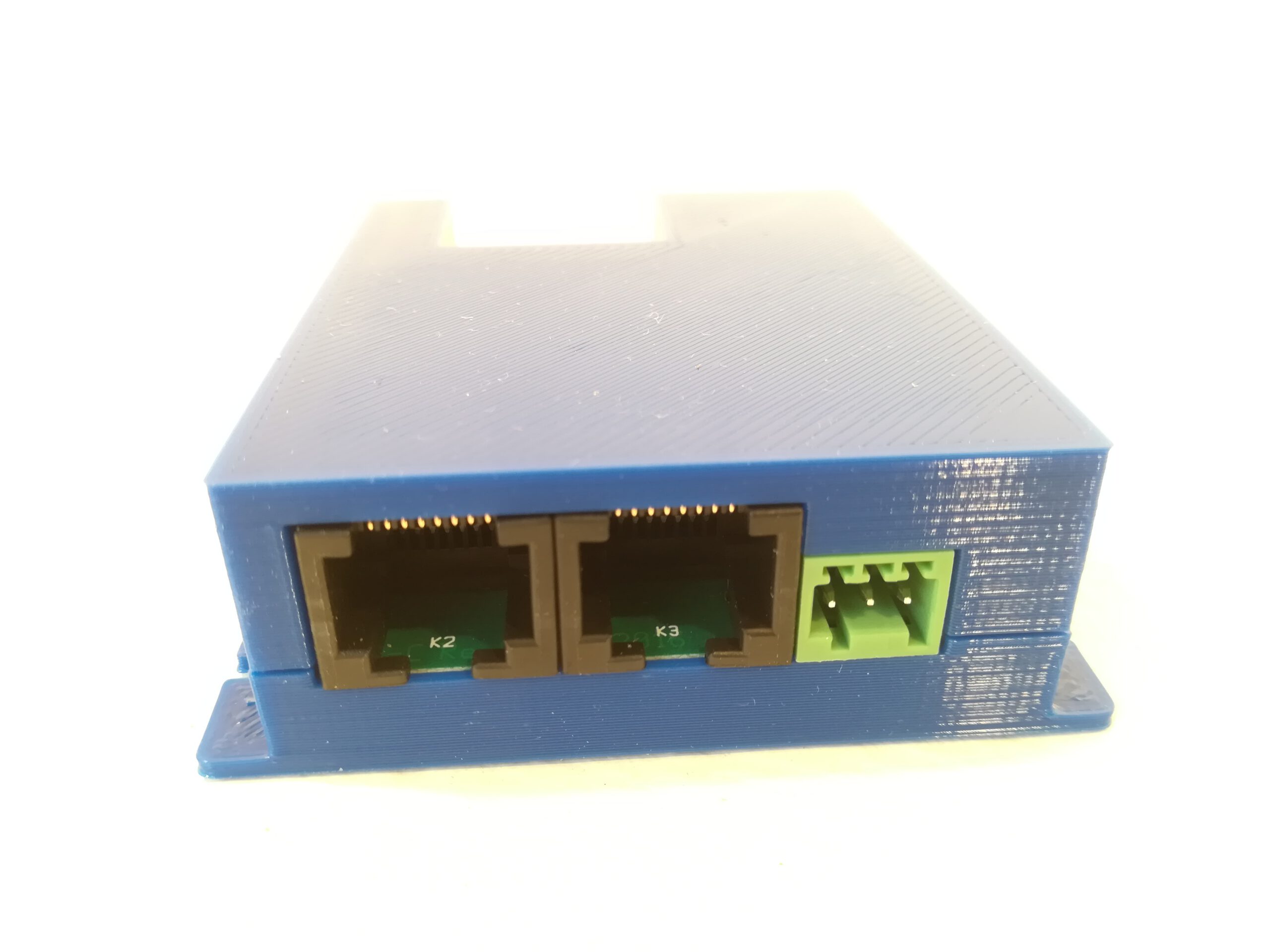 De communicatie tussen RM-U en TM44s geschiedt via een seriële verbinding op basis van RS485. Hiermee kun je grote afstanden overbruggen (tot 1200 meter), zodat je de TM44 modules kunt monteren dicht bij de blokken die de module aanstuurt. Dat scheelt flink wat bekabeling. Bij de netwerkverbinding heb je de keuze uit het maken van je eigen aansluitkabel of het gebruik van standaard RJ45 aansluitkabels.
